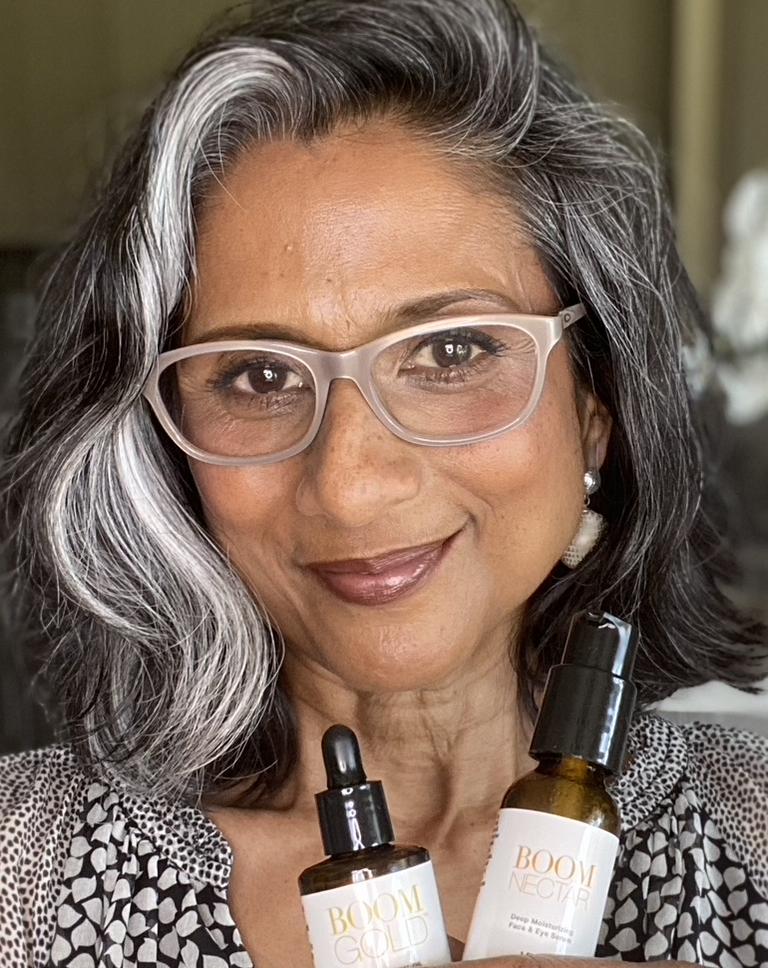 In this video, 60-year-old Jenny Johnson shows off a spa-like technique for applying our lightweight facial oil, Boom Gold, and our robust moisturizing serum, Boom Nectar.