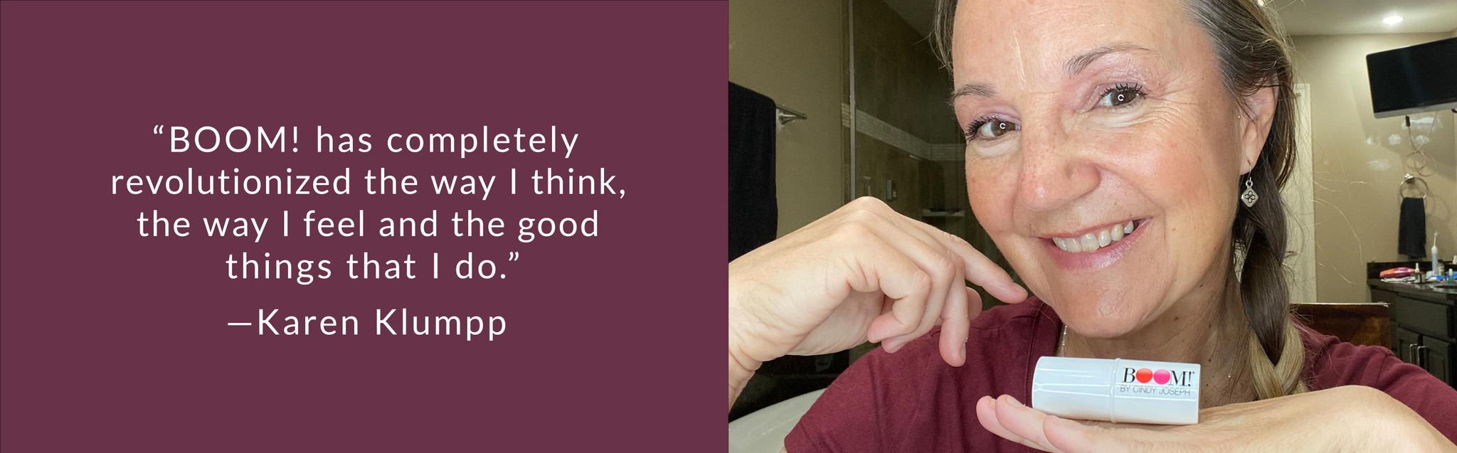 One of the changes she’s excited about is discovering Boom makeup and skin care and Cindy Joseph’s pro-age message. She says, “BOOM! has completely revolutionized the way I think, the way I feel and the good things that I do.”