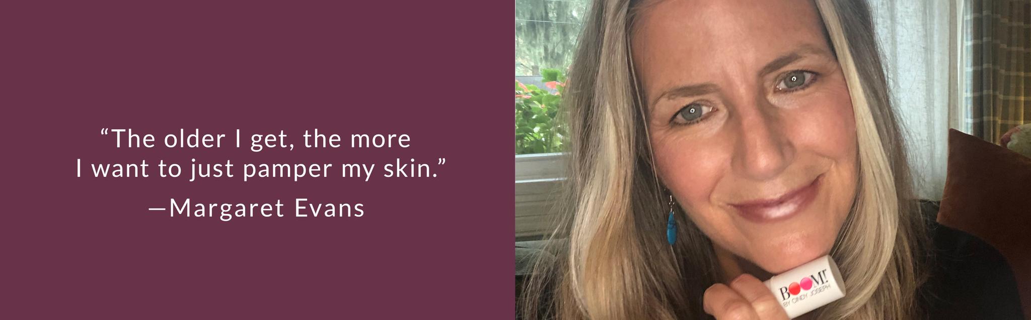 Though our pro-age philosophy is what drew Margaret in, she soon fell in love with the Boomstick Trio. But she admits she was a little skeptical about Boom skin care at first.
