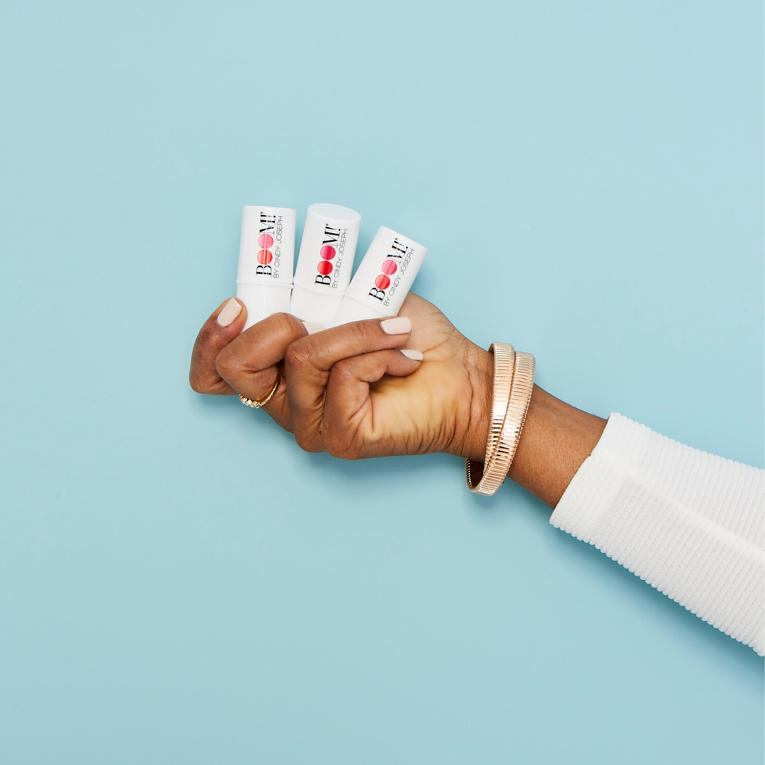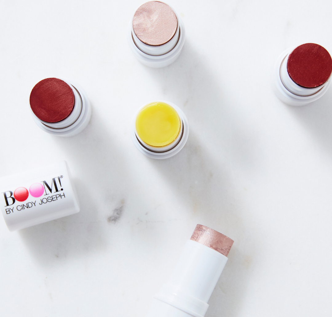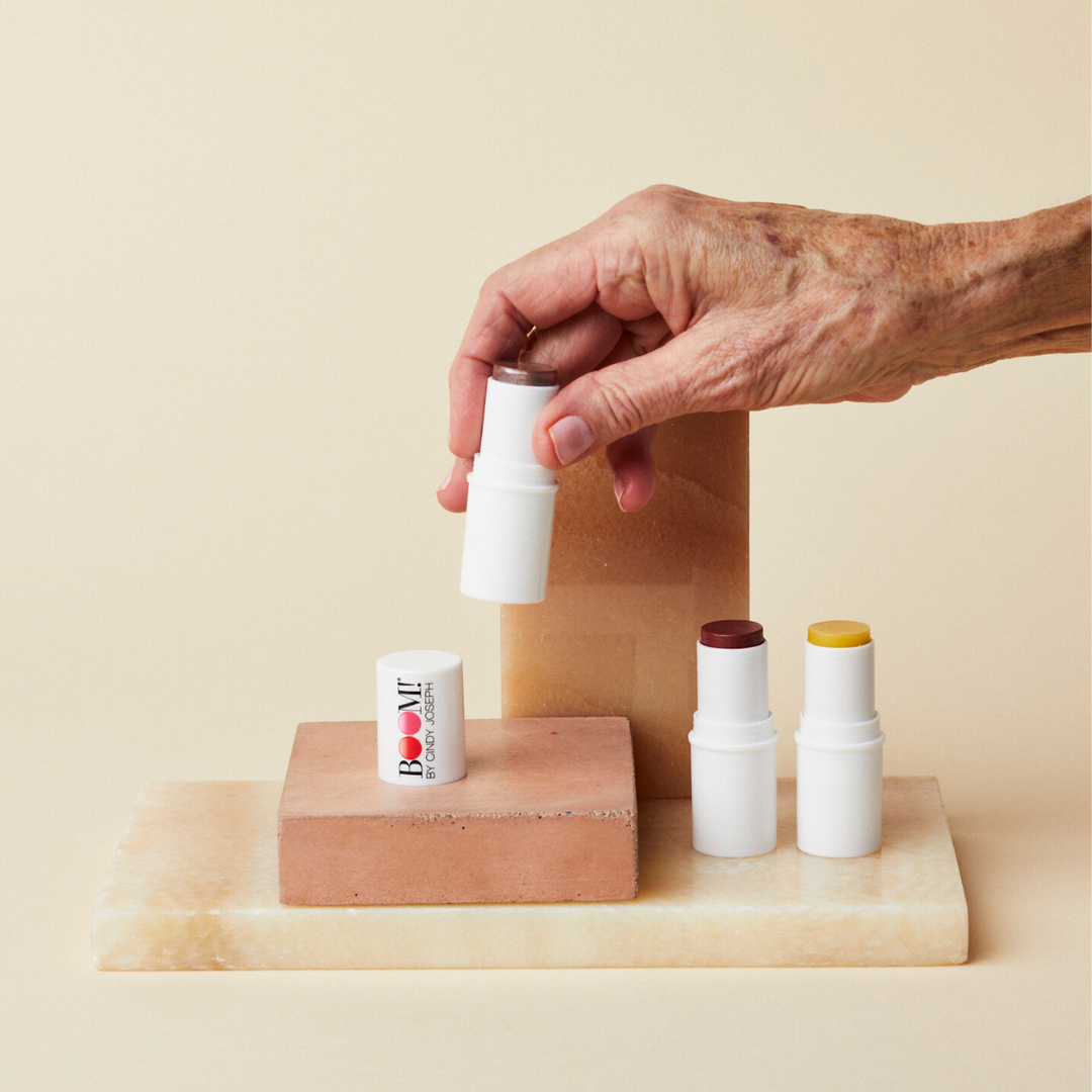 I explained that I no longer use foundation or concealers, preferring to let my skin breathe and radiate wellness with the help of Boomstick Glo and Boomstick Glimmer. Susan was thrilled to hear she might be able to forgo foundation altogether—a huge timesaver—and loves the feeling of authenticity that she gets from using these amazing natural balms. Made from organic ingredients, never tested on animals. And look at her go... isn't she stunning?